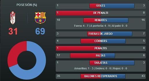 Estamos atentos a los posibles cambios que se produzcan en el descanso. En el apartado estadístico, aunque el Barcelona tiene un 66% de posesión , ha rematado tantas veces como el Granada (7).