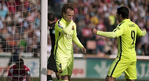 Así ha celebrado Rakitic el gol. Ha sido el quinto tanto del croata conel Barcelona, que ya le marcó uno al Granada en la primera vuelta.