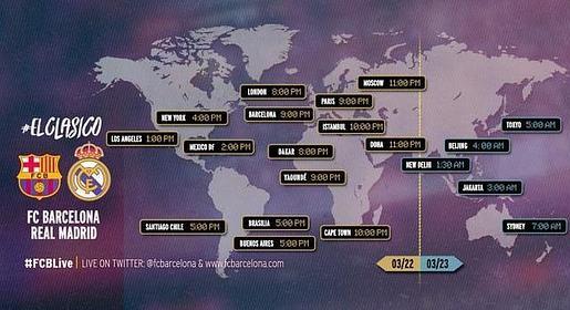 Como decíamos antes, la expectación por este partido va más allá de nuestras fronteras. El Barcelona tiene el detalle de informar en su cuenta oficial de Twitter (@FCBarcelona_es) del horario del clásico en distintos puntos del mundo.
