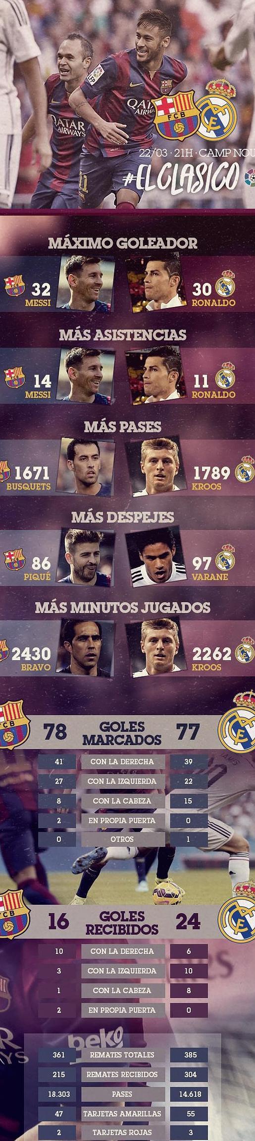 El Barcelona afronta el clásico como una oportunidad única de abrir u na brecha de cuatro puntos con los madridistas en lo alto de la tabla, donde los azulgrana lideran con un punto de ventaja. En 19 partidos seguidos en este 2015, el Barça ha fallado sólo en estos dos encuentros y ha firmado 17 victorias en todas las competiciones (Liga, Copa y Liga de Campeones), dando un salto de calidad que le ha situado líder en la Liga, en la final de la Copa del Rey y ya clasificado para cuartos de final en Europa.