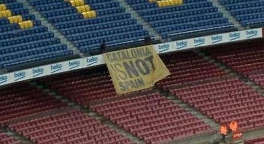 Antes de que se abran las puertas, y aún sin aficionados dentro del estadio, se ha podido ver una polémica pancarta en las gradas del Camp Nou. «Catalonia is not Spain» es el mensaje que se ha podido leer.