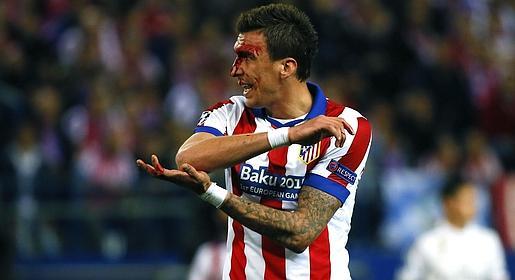Intentan cortarle la hemorragia a Mandzukic que sangra abundantemente y su enfado es monumental. Juega el Atlético con uno menos.