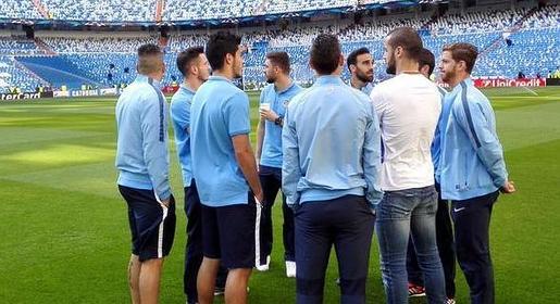 Los jugadores rojiblancos toman contacto con el césped del Bernabéu (vía @Atleti).