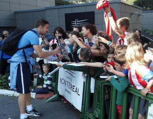 El Atlético de Madrid sale de su hotel de concentración para emprender el recorrer en su autobús oficial hacia el estadio Santiago Bernabéu. Numerosos seguidores se han concentrado para despedir a la expedición colchonera. Varios jugadores firman autógrafos (via @Atleti).