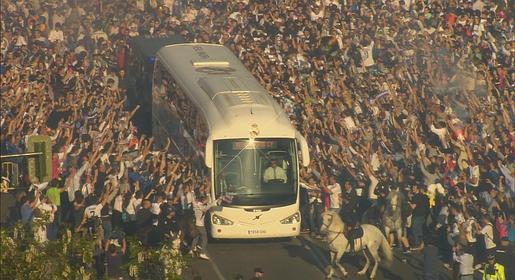 El autobús del Madrid ya está en los alrededores del Bernabéu ¡¡¡ La Policía tiene que abrir paso porque son miles los seguidores que reciben a los jugadores blancos.