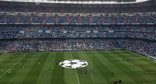 Los protagonistas ya están en la hierba del Santiago Bernabéu. Gran colorido en las gradas. AMBIENTE DE FÚTBOL ¡¡¡¡ Suena el himno de la CHAMPIONS ¡¡¡