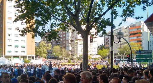 El autobús del Real Madrid se dirige ya al estadio Bernabéu. Miles de aficionados esperan su llegada. Así están los alrededores del feudo madridista. Muchísimo ambiente.