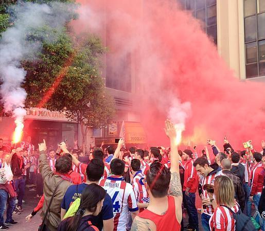 Numerosos seguidores del Atlético comienzan a reunirse en la Plaza de Castilla. Se han encendido algunas bengalas (via @George_Olmos)