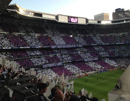 Los aficionados del Madrid despliegan un espectacular tifo mientras por megafonía suena el himno de la Décima. Miles de banderas blancas ondean en las gradas. Tremendo el ambiente que se está viviendo en el Santiago Bernabéu. Qué partido más bonito vamos a vivir ¡¡¡¡