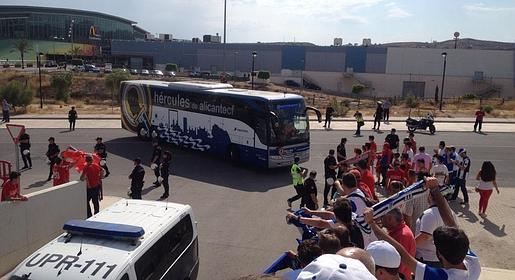 El autobús del Hércules ya ha llegado al estadio de La Condomina, donde ha sido recibido por varios aficionados alicantinos (foto vía @COPEAlicante)