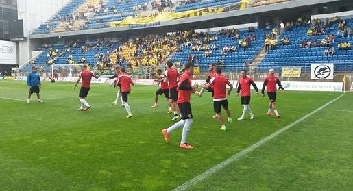 Los jugadores de ambos equipos continúan realizando el calentamiento sobre el césped del Ramón de Carranza, que aún presenta poco público en las gradas (foto vía cfhercules)