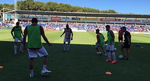 Saltan los jugadores al césped del Alcoraz para realizar el calentamiento.