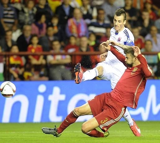 Córner a favor de Luxemburgo después de que Piqué despejara el balón. El central, que se gana el aplauso de la grada, se llevó un golpe de Bensi en esa jugada y se duele.