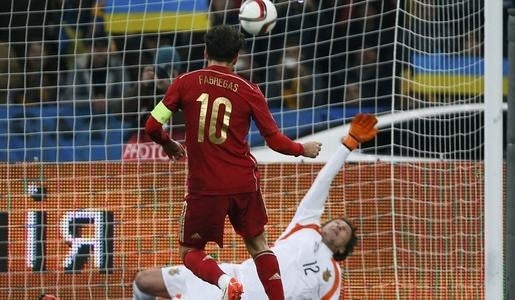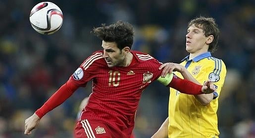 Cesc Fábregas celebra ante Ucrania cien partidos como internacional absoluto, décimo jugador que lo consigue en la historia de la selección española, titular en un equipo renovado por Vicente del Bosque, en el que debutan Mario Gaspar y Xabier Etxeita.