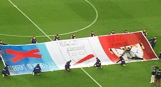 El Barcelona ha desplegado una pancarta sobre el césped del Camp Nou para reivindicar el derecho a la libertad de expresión. Es la respuesta del club azulgrana a la sanción de la UEFA por la exhibición de esteladas en el duelo de Champions ante el Leverkusen.