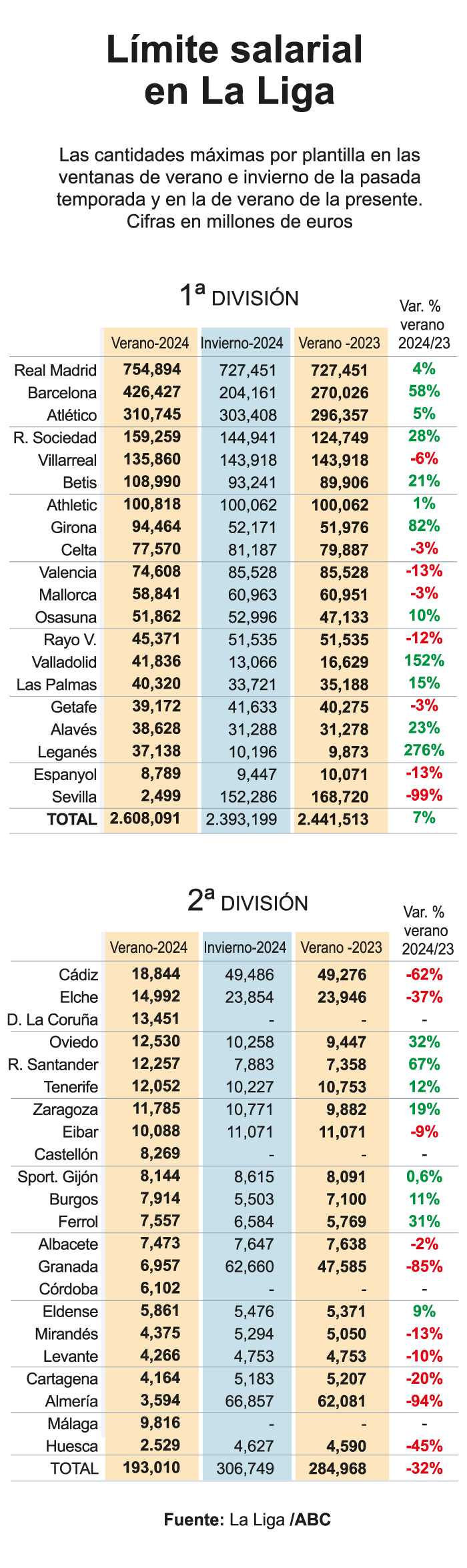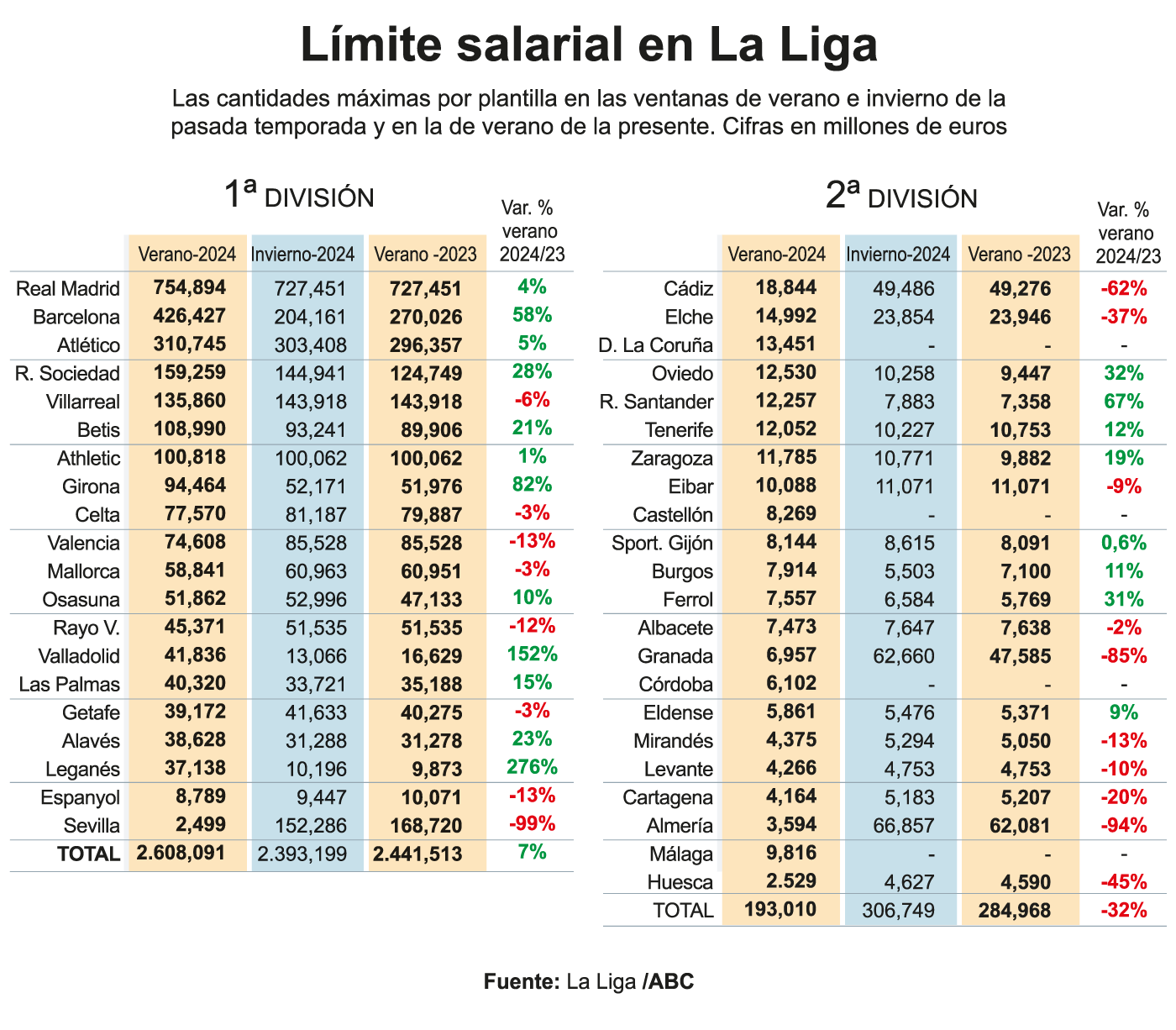 En conjunto, el LCPD de los 20 equipos de Primera división es de 2.608 millones de euros, ligeramente por encima de los 2.500 millones de euros que tenía en septiembre de 2023. Entonces los clubes excedidos de su correspondiente margen eran once entre Primera y Segunda.