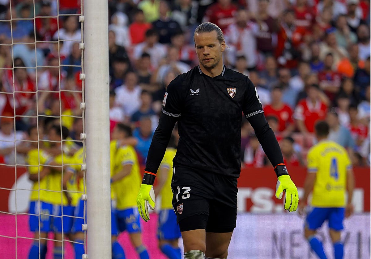 El Cádiz llegaba cada vez con más facilidad ante Nyland y el runrún de la grada despertó. La potencia con la que los gaditanos buscaban tumbar al noruego se plasmó en la cara de Sergio Ramos, que terminó noqueado tras un despeje y los servicios médicos tuvieron que atenderlo. Tras esto, otros dos saques de esquina más del Cádiz, que les inyectó la esperanza de marcar antes del descanso. Casi lo consigue Rubén Navarro, que chocó el cuero en el travesaño. La más clara del partido hasta el momento. Poco después, Chris Ramos hizo lo más difícil. Se llevó la pelota ante Badé, se marchó de Sergio Ramos y superó a Nyland... pero el disparo a puerta vacía se marchó rozando el palo. El descanso llegó con el Sánchez-Pizjuán murmurando.