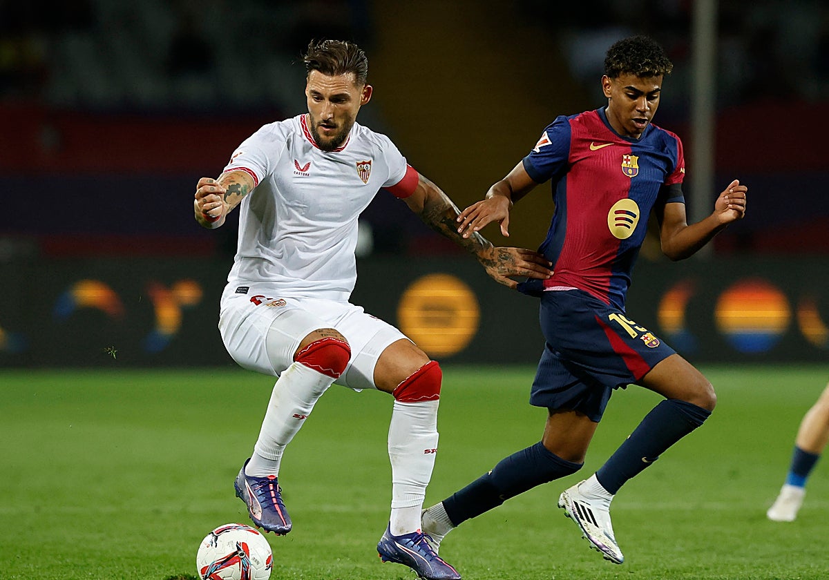 Se hizo con el balón Lamine Yamal en el área sevillista, pero su disparo se marchó muy desviado