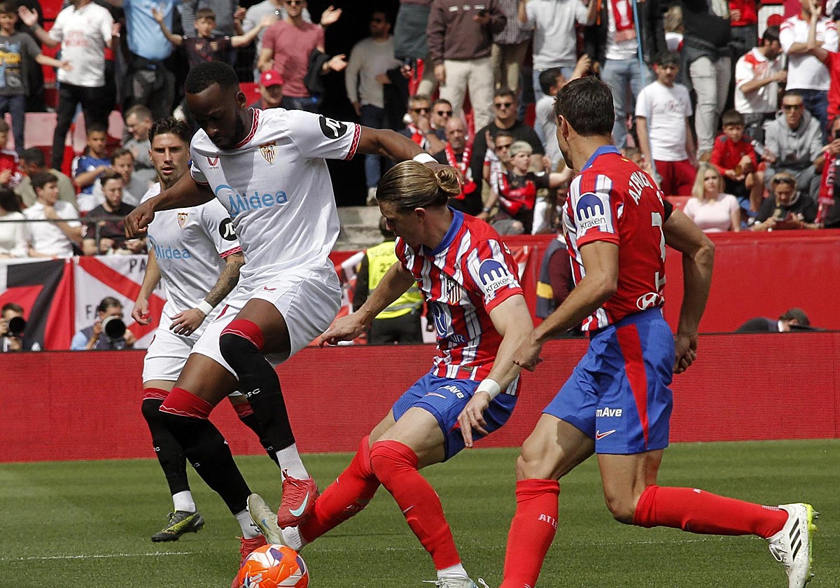 Akor Adams y Lenglet pugnan por un balón en un lance de este Sevilla - Atlético de Madrid
