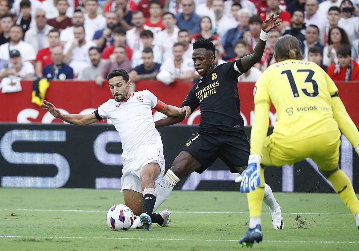 «¿Nos pegan y hay sangre? Vamos y vamos. ¿Nos vuelven a pegar? Vamos y vamos». No deja de ser llamativo que pese a tanto ruido preconcebido con el silbato mayor al final no sean los blancos, al menos anoche, quienes acaben siendo beneficiados. Historia. Lo sabe ya bien un Diego Alonso al que le tocaba liberar más a Lukebakio con el fin de que el belga fuese más peligroso de lo que estaba siendo, dado que fue de más a menos. Volvía el Sevilla a la carga con no pocas llegadas que estuvieron a punto de sorprender a Kepa, por ejemplo, con una doble ocasión en las botas de Rakitic y Ocampos, donde es el croata quien se topa con la figura de un decisivo Carvajal que bajo palos deshace el gol más cantado en Nervión. Luego es Acuña quien comete un error juvenil dando toques de más y reza por que Navas siga siendo Navas y salve al grupo de semejante entuerto. El túnel que el palaciego hace a Vinicius en banda es una oda a la belleza, y por qué no decirlo, a la justicia.