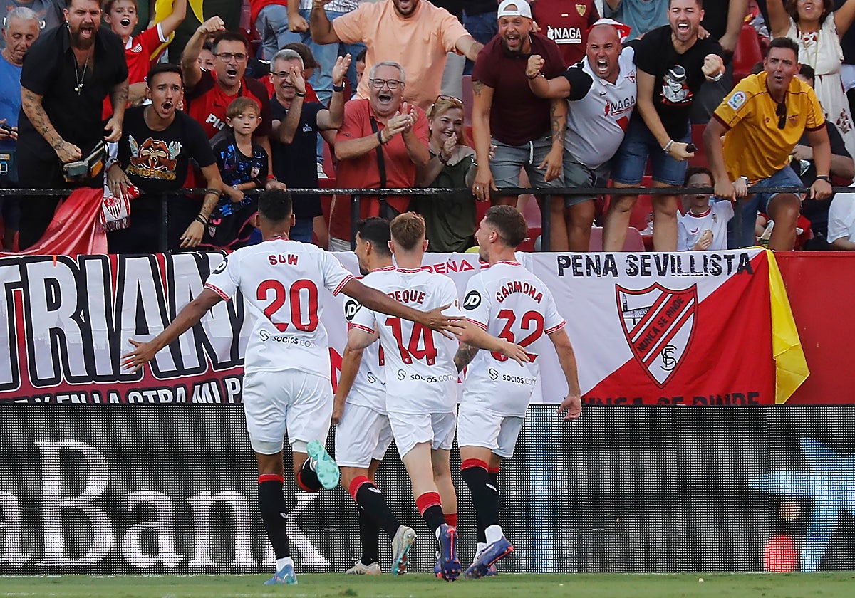 Conscientes de la importancia de obtener la primera victoria ante los suyos y de forma inmediata, el Sevilla FC arrancó el duelo controlando con pausa el balón y con máxima concentración. Los únicos sobresaltos se dieron en algún que otro paso en falso de Nianzou. Gudelj se erigió como capitán general repartiendo el juego por el centro del campo y siendo el primer contingente defensivo. Manejaron los de Pimienta con paciencia el cuero buscando el hueco por el que sorprender a Soria en los primeros compases del partido. Fueron varias las ocasiones en las que el Sevilla se acercó con peligro. La más clara, un tiro muy flojito de Pedrosa, tras una asistencia de Peque, que chocó contra Arambarri. Seguidamente, Isaac también estuvo cerca de marcar con la zurda, pero el disparo fue bloqueado por Soria.