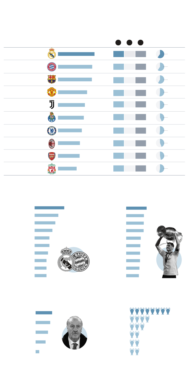 Los números no mienten. El Madrid, con la estadística en la mano, ha sido el gran dominador de la Champions. Es el equipo que más victorias tiene por número (179) y por porcentaje (59,9%), seguido de cerca por el Bayern de Múnich (59,3%), conjunto con el que más veces se ha enfrentado (20) y junto con el Barcelona, único escudo que ha seguido a los blancos en victorias, no así en títulos obviamente, apartado en el que los de Madrid no tienen parangón (ocho por cuatro de los azulgranas y tres de los bávaros). Historia que mañana escribirá una nueva entrada si los pupilos de Ancelotti consiguen celebrar sus trescientos partidos en la máxima competición europea con una victoria.