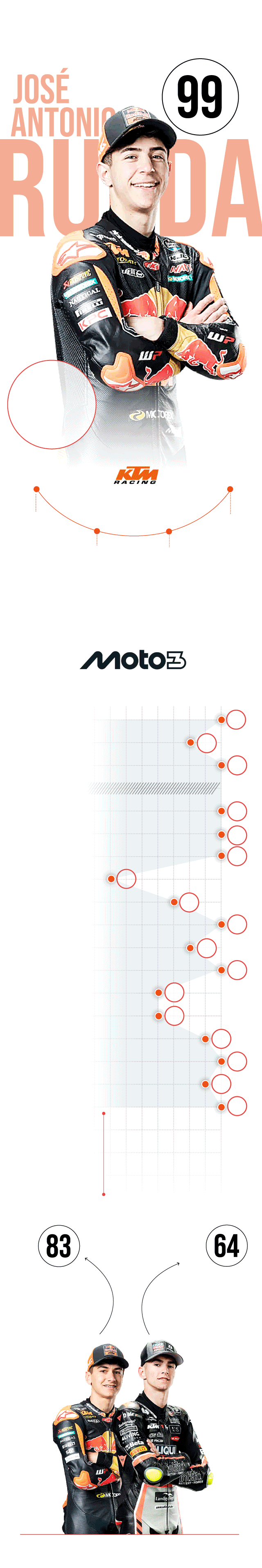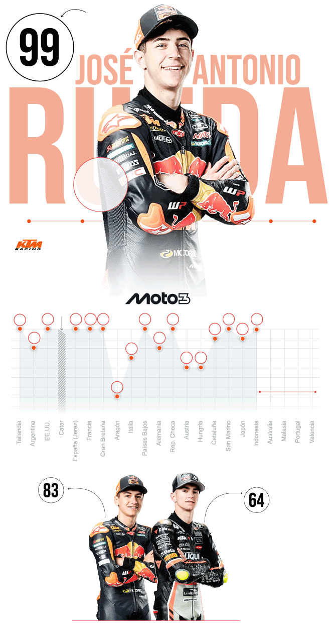 José Antonio Rueda parecía predestinado para ganar el Mundial. Y no por su apellido, que le viene al pelo; tampoco por sus cualidades, que parecen innatas y ha ido mejorando y puliendo con los años; sino por esa condición de pionero que le acompaña desde que fuera el primer piloto en conquistar el Mundial júnior y la Red Bull Rookies Cup en el mismo año. Un doblete histórico que lo catapultó hasta el Mundial bajo la estructura del Red Bull KTM Ajo, «el equipo con el que quería ser campeón del mundo». Y con el que tiene contrato para el año que viene pero en otra categoría, Moto2, un merecido y justificado ascenso en el que encontrará un nuevo desafío, más difícil, tras pasarse el juego en el peldaño inferior. El 'Rayo McQueen' palaciego, como lo llaman desde crío, seguirá corriendo en busca de otros sueños.