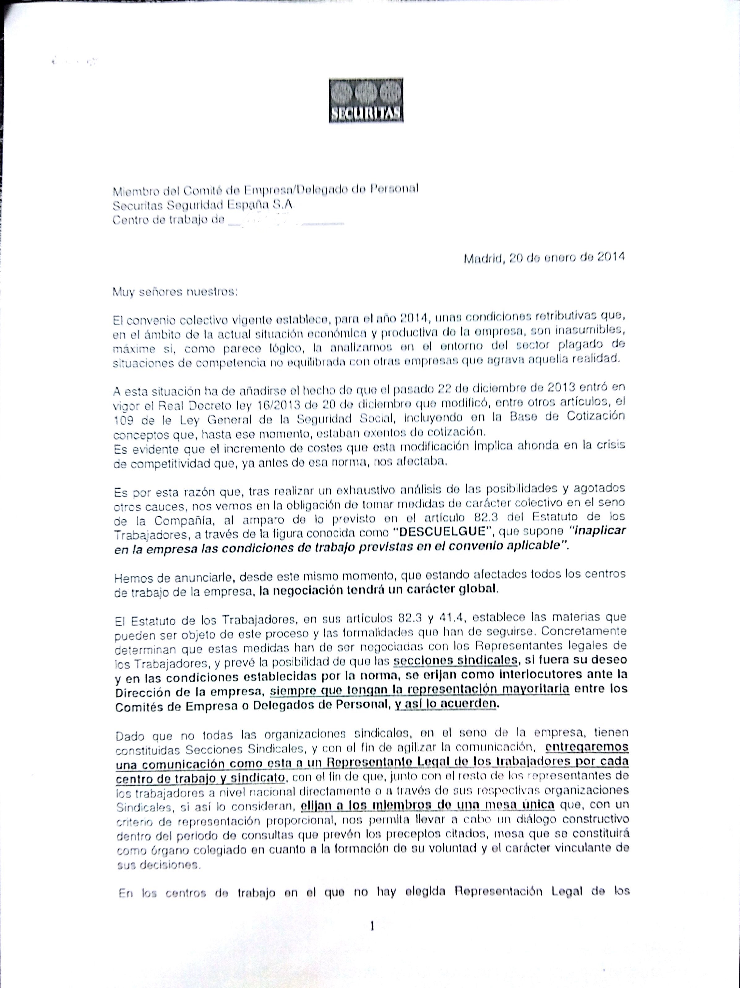 Por su parte, Securitas también ha anunciado a sus trabajadores su intención de «descolgarse» del convenio colectivo y, por tanto, no aplicar las condiciones de trabajo y las retribuciones pactadas con los representantes de los trabajadores. Securitas explica su decisión, que afectará a todos los centros de trabajo de la empresa, por la situación económica y productiva de la empresa.