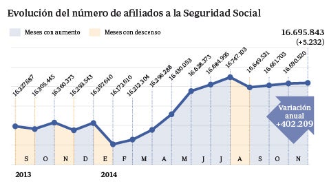 El número de afiliados a la Seguridad Social se incrementa en 5.232 personas, el mayor aumento desde el año 2007. El número de desempleados se situó en 4.512.116
