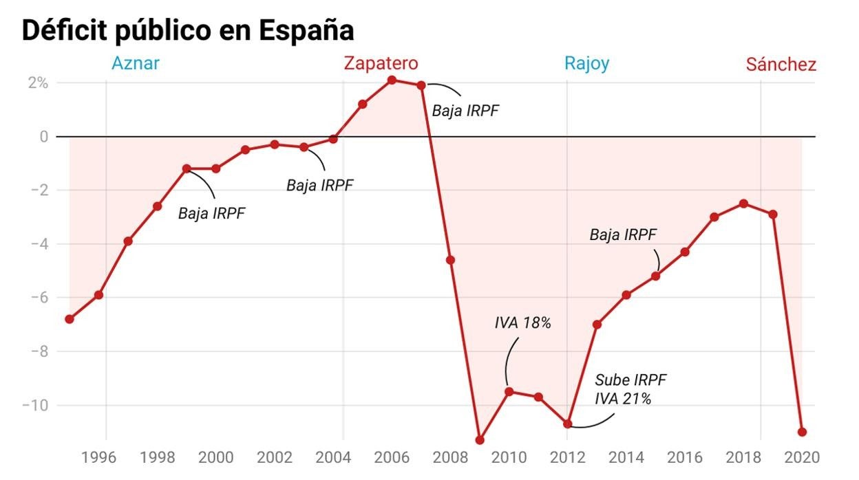 Si en 2018 España, por primera vez en una década, salía del Procedimiento de Déficit Excesivo (PDE) al bajarlo del 3% del PIB y parecía haber iniciado, tímidamente, la bajada de la deuda pública, en 2019 el Gobierno de Pedro Sánchez, elevó el desequilibrio por primera vez desde 2012, al 2,9%, todo ello en año electoral por partida doble, ante la repetición de las elecciones generales. Ello redujo más un margen fiscal que peligraba, justo antes de la mayor crisis económica desde la Guerra Civil, cuando el despliegue de los ERTE, prestaciones por cese de actividad y demás medidas del escudo social han disparado el déficit y la deuda.