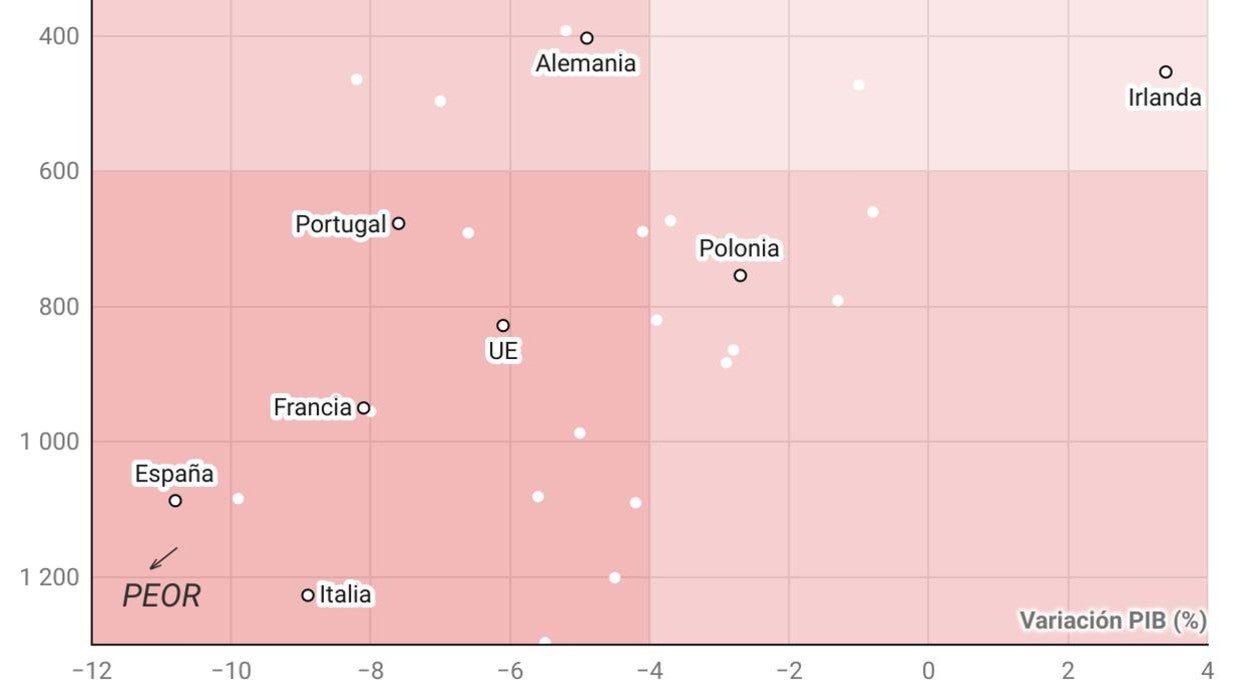 En el lado opuesto, en el extremo con mayor daño para la salud y la economía en 2020, el país peor situado es España, con altos datos de mortalidad y los peores datos económicos. Reino Unido, Italia y Francia le acompañan en la zona baja, aunque con mejores datos que España en ambos indicadores, a excepción de la mortalidad italiana.