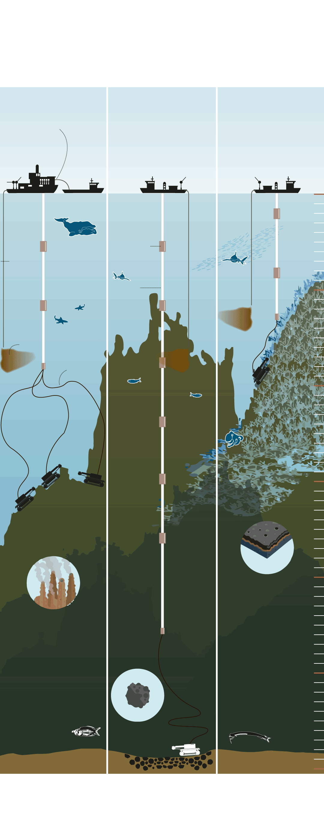 A grandes rasgos, así es la tecnología para extraer minerales del fondo de los océanos: «No es excavar un túnel —detalla Javier González—. Los nódulos de manganeso son como pelotas de tenis que están en la superficie del fondo. Y las costras de manganeso recubren las rocas del fondo marino. Hay que bajar con máquinas hasta 4.000 metros y trabajar sobre estas superficies. Los buques operan en remoto a los robots que hacen la recolección del mineral y las bombas succionan ese mineral hasta el buque, que lo almacena y lo lleva a plantas de tratamiento en tierra firme». En este proceso muchas cosas pueden ocurrir: enturbiar y remover el fondo marino, arrastrar poblaciones de fauna, destruir ecosistemas como esponjas y corales, liberar sustancias tóxicas y gases de efecto invernadero secuestrados durante millones de años en los fondos... como expone un informe de Ecologistas en Acción. Todo esto «se intenta solventar para afectar lo menos posible al fondo marino», asegura González.