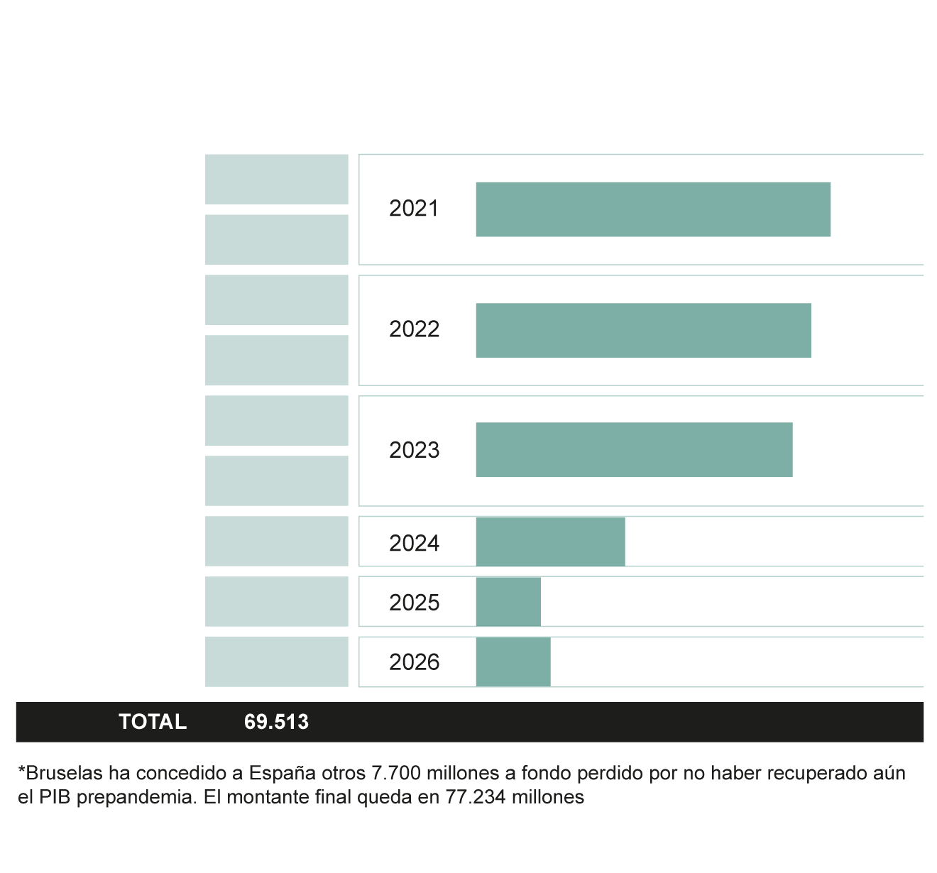 *Bruselas ha concedido a España otros 7.700 millones a fondo perdido por no haber recuperado aún el PIB prepandemia. El montante final queda en 77.234 millones