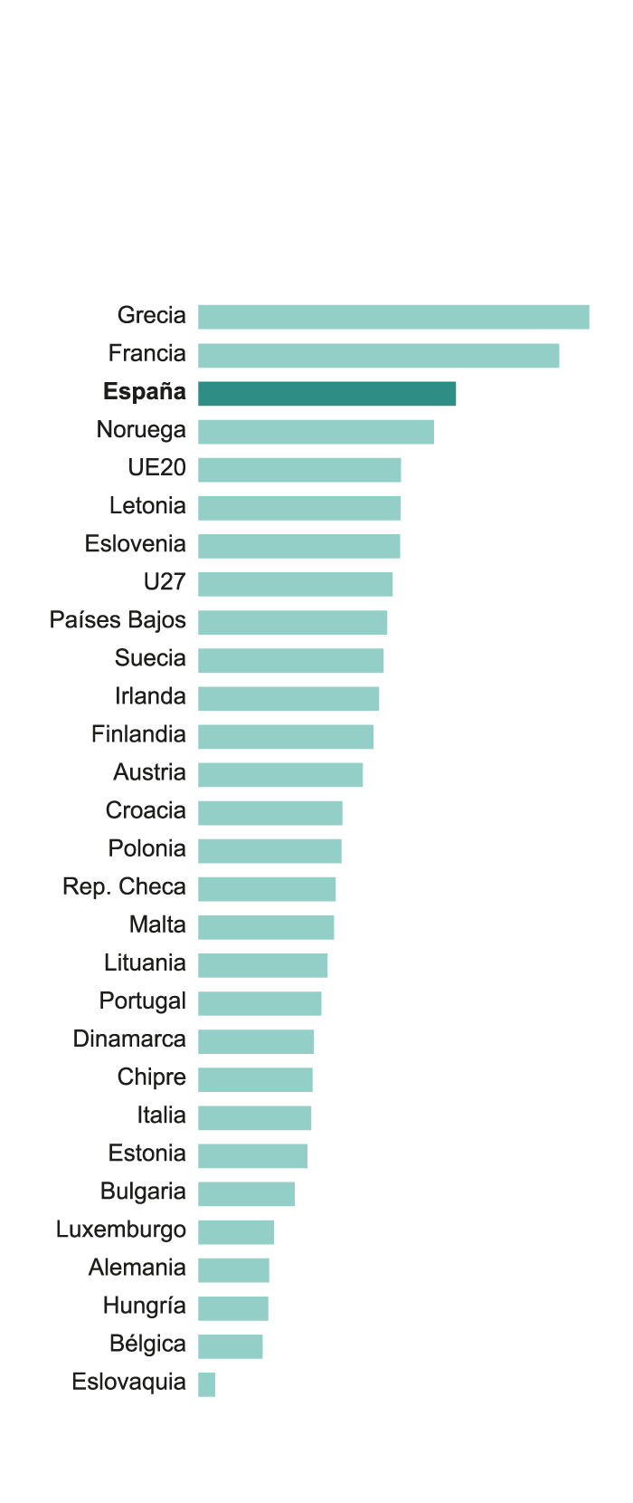 El problema se agrava cuando se toman solo las familias que tienen hijos a su cargo. De nuevo, nuestro país es el tercero de la tabla, con un 20,8% de hogares en aprietos para pagar la factura del alquiler en 2023. Por delante estuvieron Francia (33,2%) y Grecia (26,3%), y en la parte baja de la tabla, Rumanía, donde podría decirse que no se da el caso (menos del 0,0%), Eslovaquia (1,2%) y Bulgaria (3,7%).