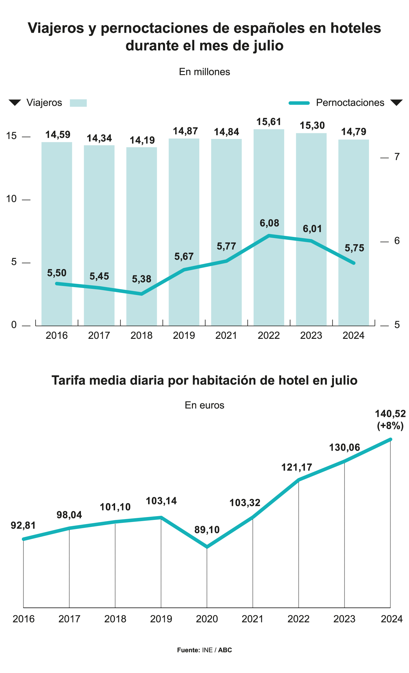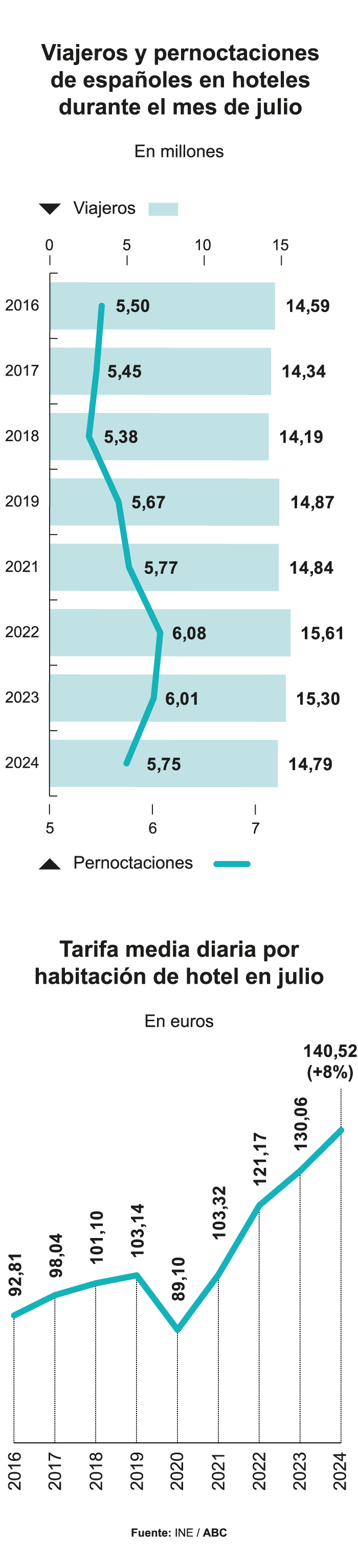 El turista nacional se había convertido en los últimos años en uno de los baluartes de la recuperación hotelera, llegando a hacer récord histórico de pernoctaciones en 2022, pero todo se ha difuminado conforme los empresarios han disparado los precios para exprimir el 'boom' turístico que se vive a nivel mundial y que durante el verano tiene al visitante del Norte de Europa como el más codiciado por su mayor poder adquisitivo. En julio, el precio medio diario que se pagó por habitación alcanzó los 140 euros, según el Índice de Precios Hoteleros del INE, un 36% más que en 2021 y que en 2019, años en los que la tarifa media fue de 103 euros.