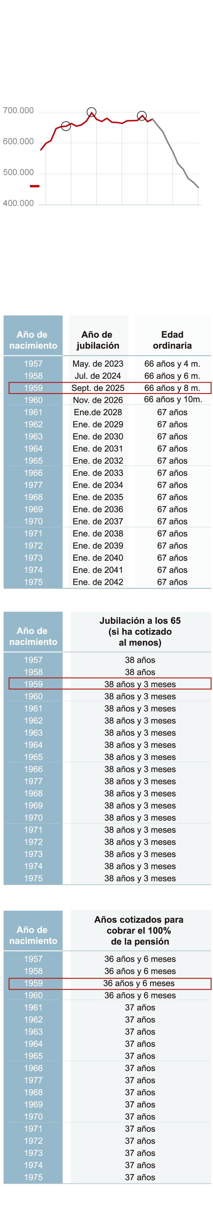 En el trasfondo de todas estas reformas se encuentran las medidas de contención de gasto ante el retiro masivo del 'baby boom': los ciudadanos que nacieron entre finales de los años 50 y principios de los 70. En aquella época llegaban a nacer casi 700.000 españoles cada año –ahora apenas nacen 322.000–. Y como llega el momento de su jubilación, las cuentas de la Seguridad Social se verán tensionadas al menos hasta 2040. Un retiro más tardío, con más años de cotización y menos incentivos para hacerlo anticipadamente tratan de ajustar el presupuesto: 200.000 millones en gasto anual; 165.000 millones en cotizaciones; y una deuda de 126.000 millones.