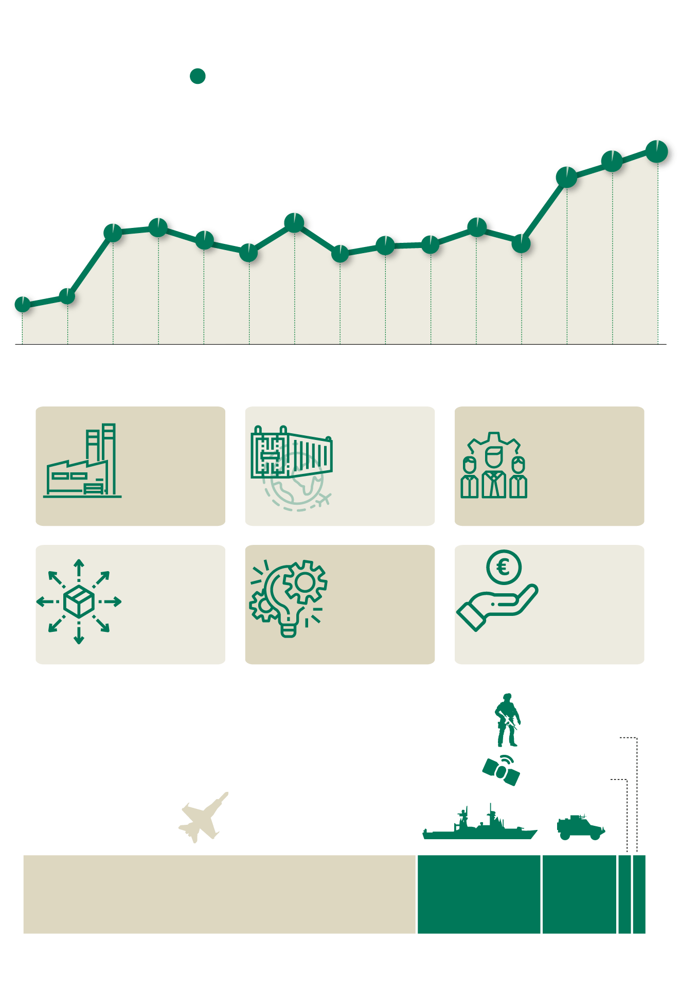 Las industrias que forman parte de la Asociación Española de Empresas Tecnológicas de Defensa, Seguridad, Aeronáutica y Espacio (Tedae) cerraron el ejercicio de 2021 con una facturación total de 11.594 millones de euros, un 2% más con respecto al año anterior. Se estima que esta cifra representa el 1,4% del PIB nacional. El sector todavía no ha alcanzado los niveles Precovid (14.101 millones en 2019), pero sí se constata una recuperación, con secciones que crecen a doble dígito, como la de defensa terrestre (15%) y la de seguridad (12%), según los datos del informe elaborado por KPMG para Tedae. La importancia de esta industria para la economía española tiene que ver no solo con el efecto directo en términos de actividad y empleo, sino también por la capacidad tractora sobre otros sectores. «Se estima que en 2021 tuvieron un efecto indirecto de 5.600 millones de euros. Además, se trata de sectores que generan un empleo de calidad y de alta cualificación y que realizan importantes inversiones en I+D+i, que estaría en torno al 13% del total nacional», explica Begoña Cristeto, socia responsable de Industria, Automoción y Química de KPMG en España.
