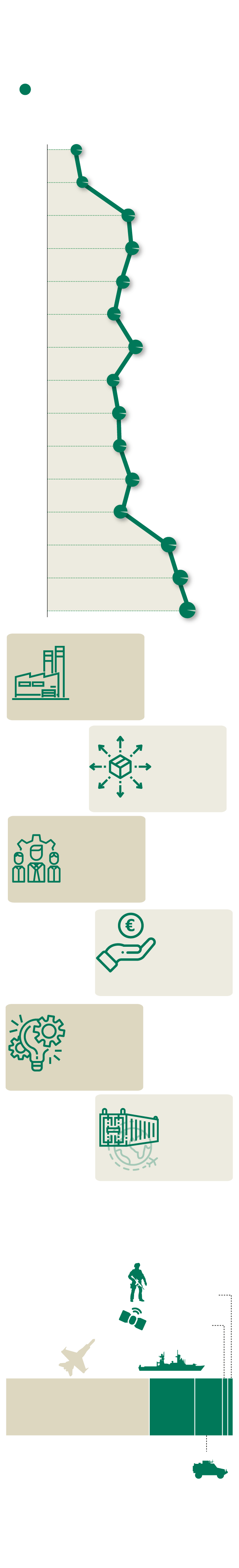 Esta industria destinó a I+D+i en torno a 1.177 millones de euros, siendo junto con el sector automoción los que mayor volumen de fondos destinaron en este sentido, según los datos facilitados por Tedae. Desde KPMG indican que la apuesta en inversión en I+D e innovación es lo que va a permitir mantener el nivel de competitividad a nivel internacional. «Las capacidades tecnológicas de la industria de la defensa permiten una mayor resiliencia para adaptarse a situaciones de crisis, como lo han sido la pandemia o el conflicto de Ucrania, pero también la posibilidad de transferir esa tecnología para uso civil, mejorando la independencia tecnológica y produciendo con un mayor valor añadido», apunta la consultora.