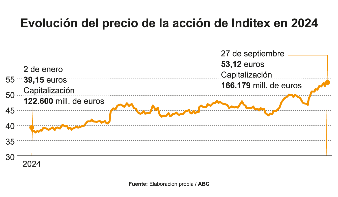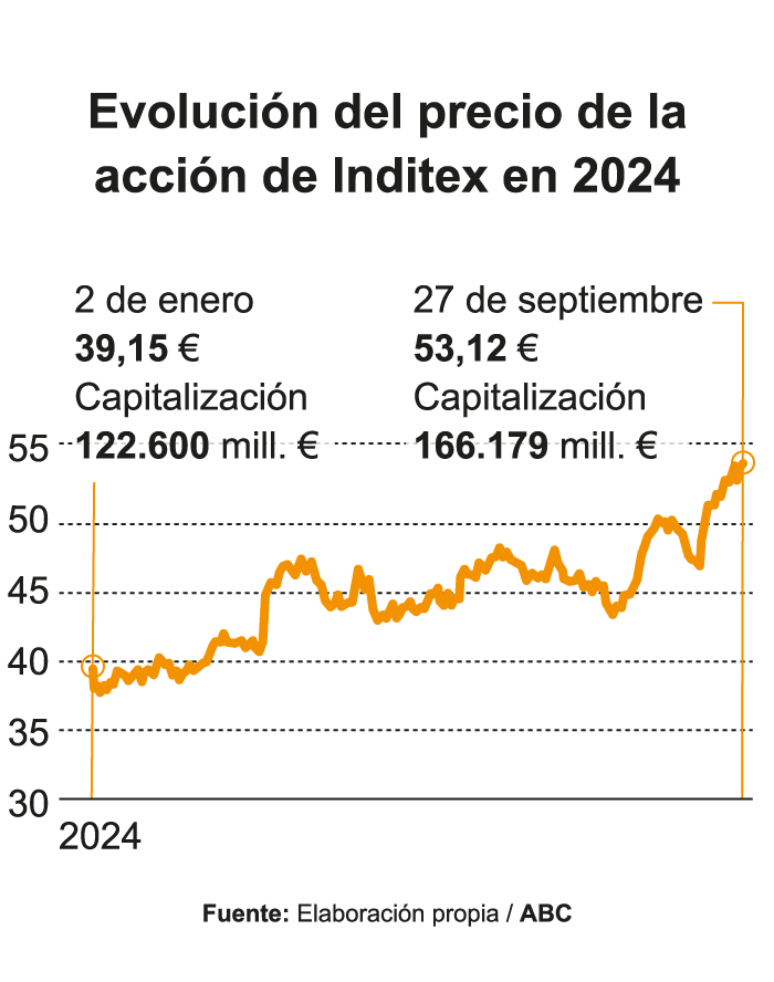 Iniciar sesiónInditex va como un tiro. Los expertos y analistas consultados no quieren utilizar esa expresión, y dan giros sobre fórmulas más adaptadas al lenguaje financiero. Pero la realidad es que la compañía textil está teniendo un ejercicio histórico en Bolsa, y financieramente ... no para de crecer. El argumento lo ofrecen las cifras. Con la acción en máximos (el viernes cerró a 53,32 euros por título frente a los 39,15 euros de inicio de año), la valoración de la compañía ha crecido en más de 40.100 millones de euros desde que empezó el año, y su capitalización se sitúa en los 166.179 millones. Esto también se refleja en el retorno que obtiene el máximo accionista de la empresa con el 59%. Amancio Ortega ha visto como su participación se ha incrementado en más de 23.700 millones desde que 2024 arrancó su primera página del calendario. Unas cifras que, si ningún contratiempo lo impide, irán a más.