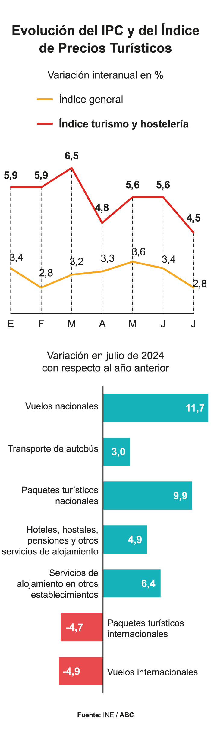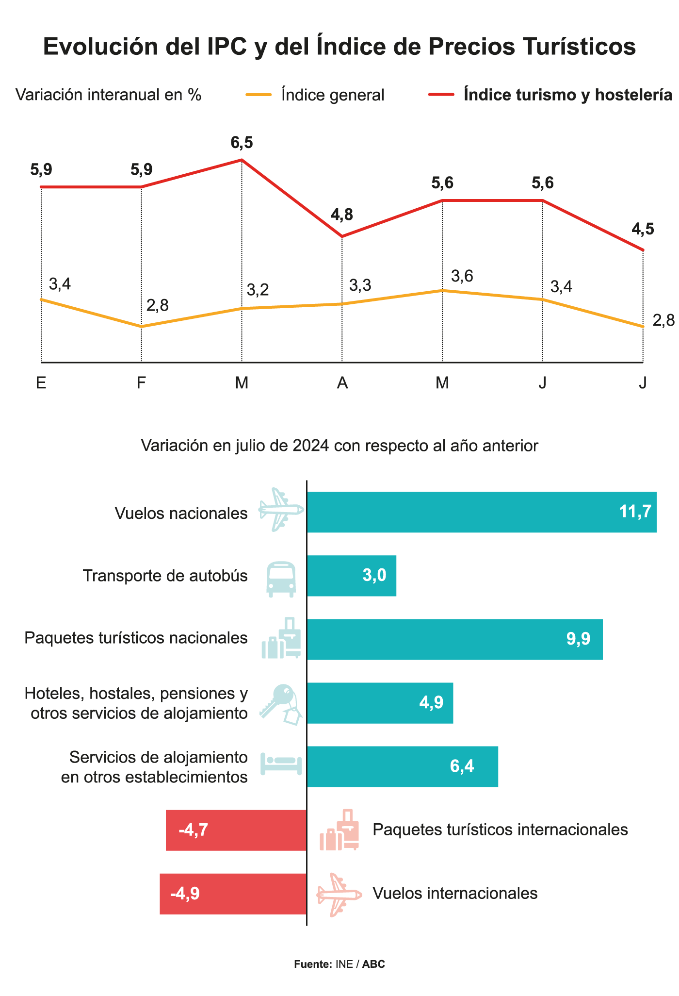Iniciar sesiónUn verano más caro, pero también uno en el que se prevén nuevos récords. La de 2024 será una temporada marcada por las protestas y la polémica sobre si el turismo de masas es sostenible para los ciudadanos españoles, pero también será una temporada que, ... si concluye según lo previsto, traerá consigo nuevos datos históricos. Y ello a pesar del mayor coste de las vacaciones. Los precios turísticos suben, durante la mayoría de meses de 2024, el doble de lo que aumenta el IPC. Se puede ver en la evolución de ambas cifras desde enero hasta julio (gráfico adjunto). En ese mes, la inflación general se situaba en el 2,8%; mientras, los precios turísticos crecían un 4,5%.
