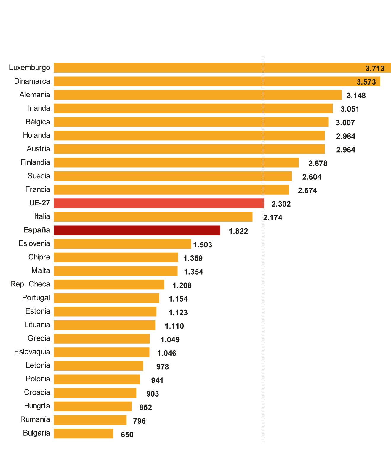 Por último, nueve países registran salarios medios de más de 2.600 euros por mes. Son los casos de Suecia (2.604 euros/mes), Finlandia (2.678 euros/mes), Austria (2.964 euros/mes), Holanda (2.964 euros/mes), Bélgica (3.007 euros/mes), Irlanda (3.051 euros/mes), Alemania (3.148 euros/mes), Dinamarca (3.573 euros/mes) y Luxemburgo (3.713 euros/mes). Este grupo es más homogéneo que los dos anteriores, ya que la diferencia máxima es inferior al 30%.