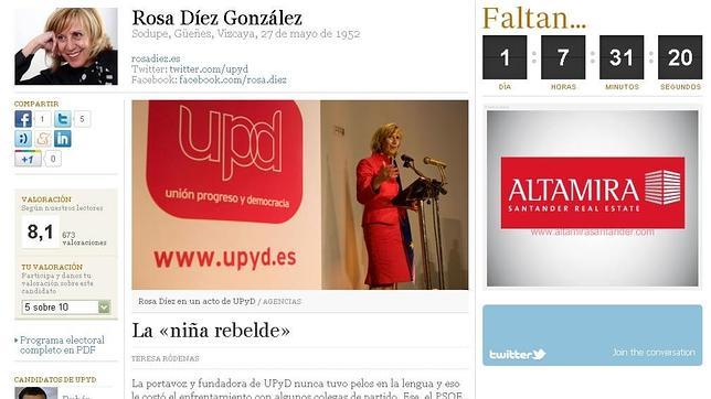 La «número uno» de UPyD al Congreso por Madrid y candidata a la Moncloa, Rosa Díez, ha sido la política mejor valorada por los lectores de ABC.es en los días previos a las elecciones generales del 20-N. Le siguen como dirigentes más valorados, el candidato popular, Mariano Rajoy, con una puntuación de 6,3 y el líder del partido ecologista Equo, Juan José López de Uralde, con una media de 6,2.