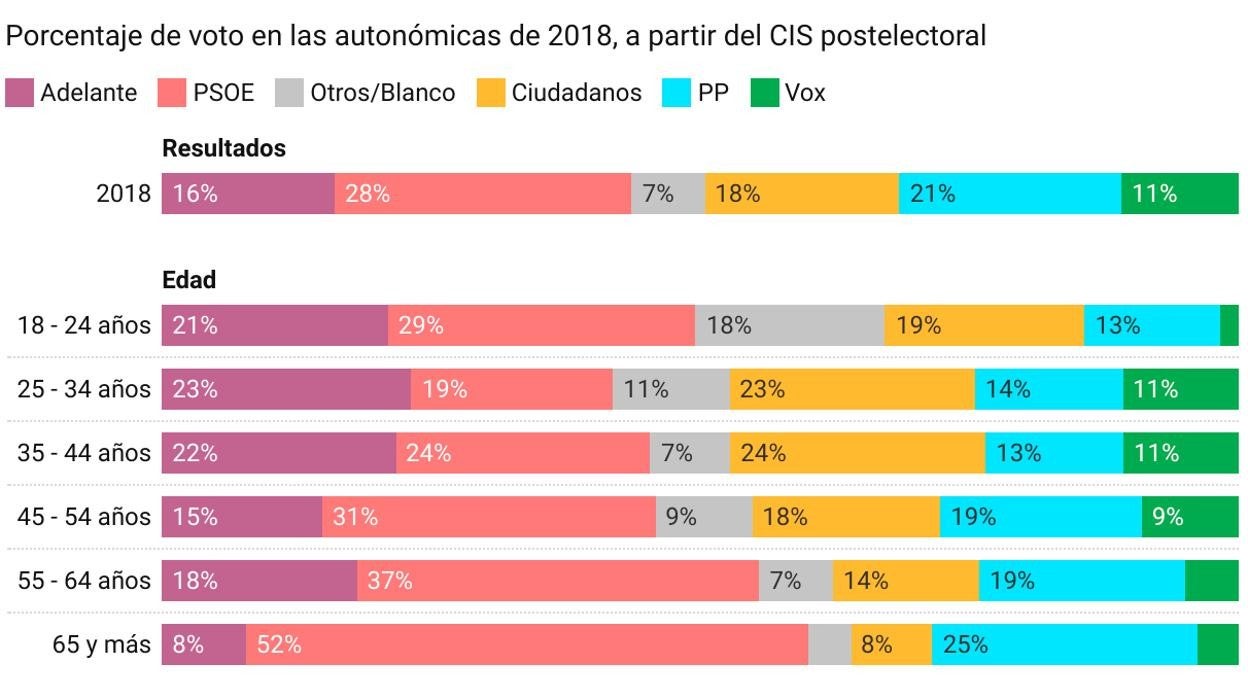 En las pasadas elecciones andaluzas, las celebradas en diciembre de 2018, el 36% de los votantes tenía más de 55 años. En parte, el voto de los mayores configuró cuál fue el resultado final de los comicios, ya que este se asemeja mucho más ... a cómo se repartió el voto entre ellos que entre los jóvenes entre 18 y 34, según el barómetro postelectoral realizado entonces por el Centro de Investigaciones Sociológicas (CIS).