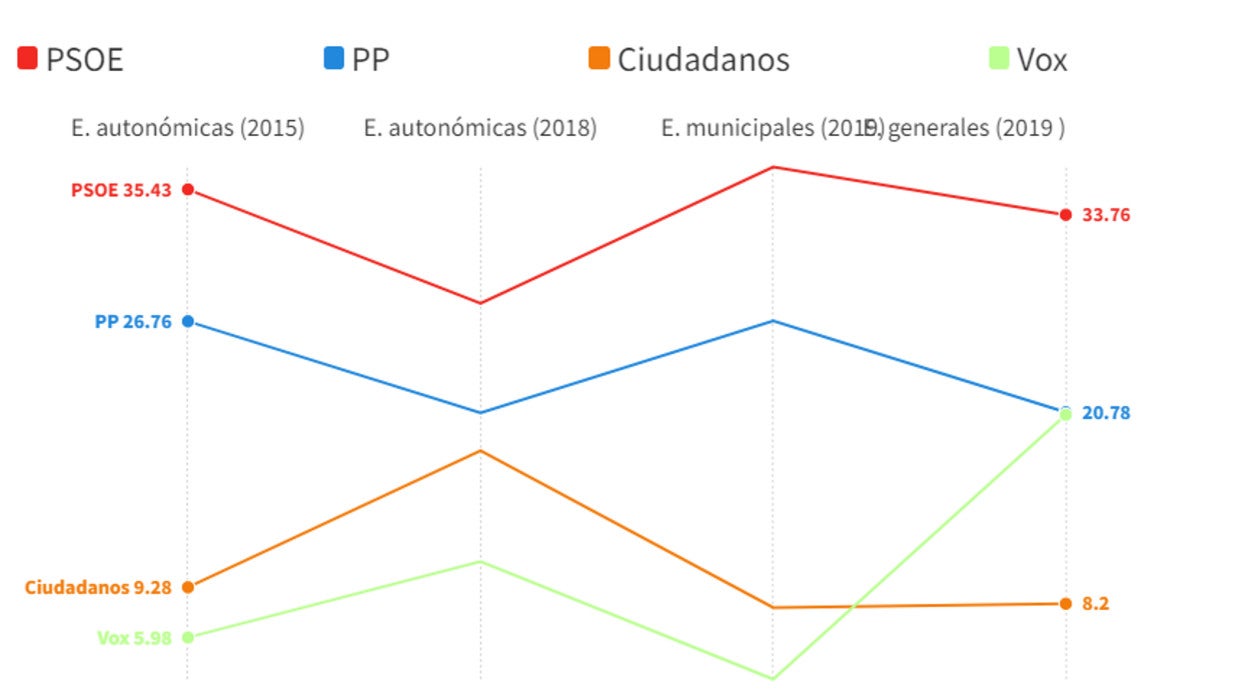 Aunque Vox ya está presente en las elecciones autonómicas de 2015 , sus resultados no llegan a ser significativos puesto que apenas alcanzan el 0,5%, y es en diciembre de 2018 cuando esta formación consigue el 10% del voto y logra 12 escaños. No obstante, en las elecciones municipales sufre una importante caída en el número de electores que apenas supera el 3%.