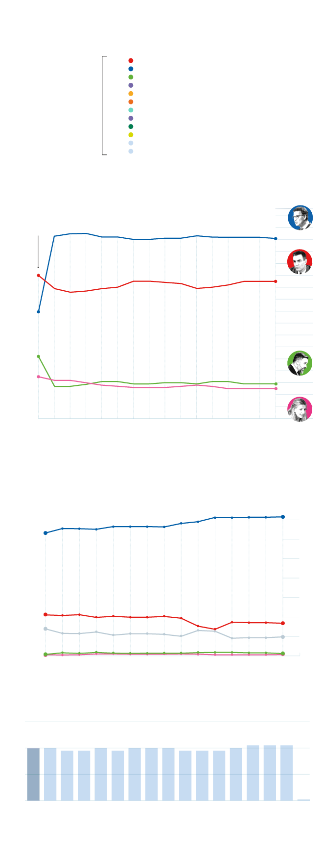 Con todo, el margen de seguridad se reduce, ya que a principios de mes (4 de julio) llegaron a sumar 186. Feijóo inició este sondeo diario en 152 diputados, uno menos que ahora, pese a que avanza cuatro décimas en intención de voto, del 36,6% al 37%, para ganar hasta 62 escaños respecto a los que le dejó Pablo Casado (89).
