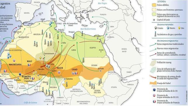 Detallamos a continuación la importancia que desde el punto de vista de la seguridad y la defensa adquiere el continente africano, según puntualizó el ministro, para los intereses de España. Obviamente, el primero hace expresa mención a las actividades yihadistas que se desarrollan en la franja del Sahel por «la agresiva expansión de las visiones salafistas y la incipiente takfirista del Islam provocada por grupos como Al Qaida y movimientos como Ansar Dine, que ha deteriorado la convivencia y azuzado las tensiones religiosas».