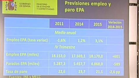 Las previsiones incluyen la creación de 20 millones de empleos , según indica la vicepresidenta. A finales de 2015 la tasa de paro se situará «muy claramente por debajo de la cifra que nos encontramos cuando llegamos al Gobierno», asegura, y además confía en que estas previsiones se pueden mejorar.