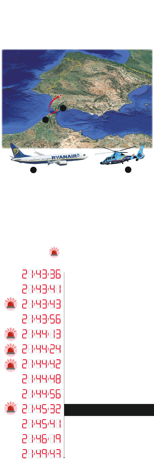 La secuencia comenzó minutos después del despegue rutinario del Boeing 738 de Tánger, con destino a Sevilla, a las 21:43:36. Cinco segundos después la torre de control ya intentó, sin conseguirlo, entrar en contacto por radio con el helicóptero, que estaba en una zona que iba sobrevolar el avión.