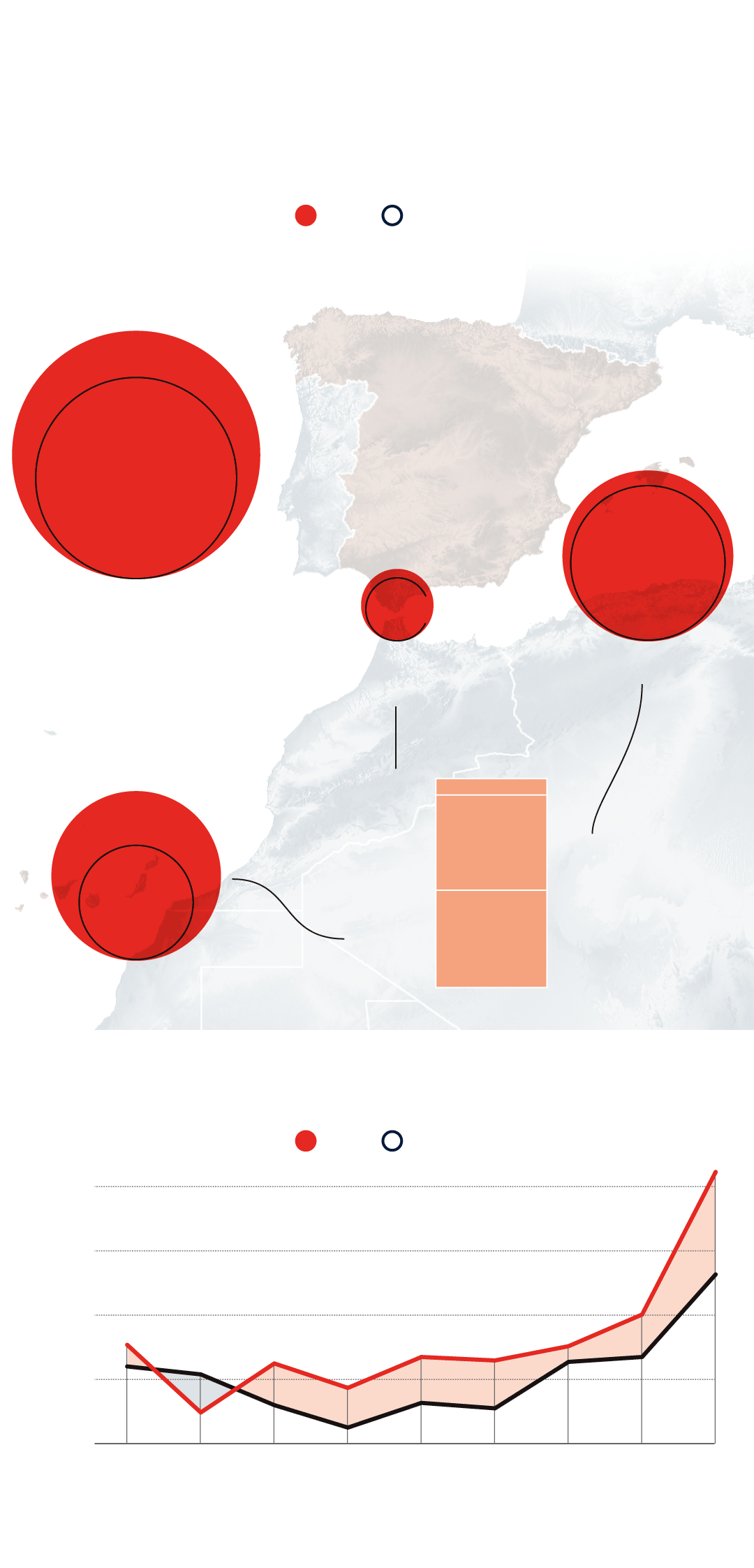 Con números, hasta el 1 de octubre la Organización Internacional para las Migraciones cifra en algo más de 1.050 las personas que han perdido la vida o han desaparecido en su travesía hacia España. Sin embargo, organizaciones humanitarias como Caminando Fronteras , que lleva a cabo un monitoreo de las muertes y desapariciones en el Mediterráneo y el Atlántico , elevan esa cifra a los 2.000 fallecidos durante el primer semestre del año. Un 526 por ciento más que el año pasado, según datos de la ONG .