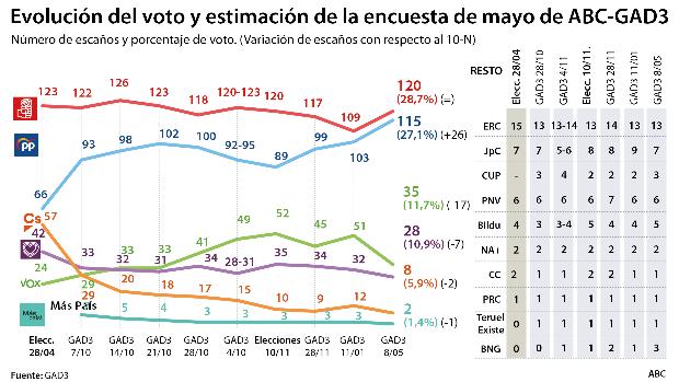 Madrid Actualizado: GuardarLa crisis del coronavirus está dando un vuelco espectacular al escenario político en España, que aún está muy lejos de estabilizarse. En esta primera foto fija electoral, cumplidas ya ocho semanas de estado de alarma, el centro-derecha se impone con claridad a la izquierda, con un Partido Popular que capta votos del PSOE, de Ciudadanos y de Vox y se dispara hasta los 115 escaños estimados, a solo cinco de los socialistas, según el último barómetro de ABC/GAD3.